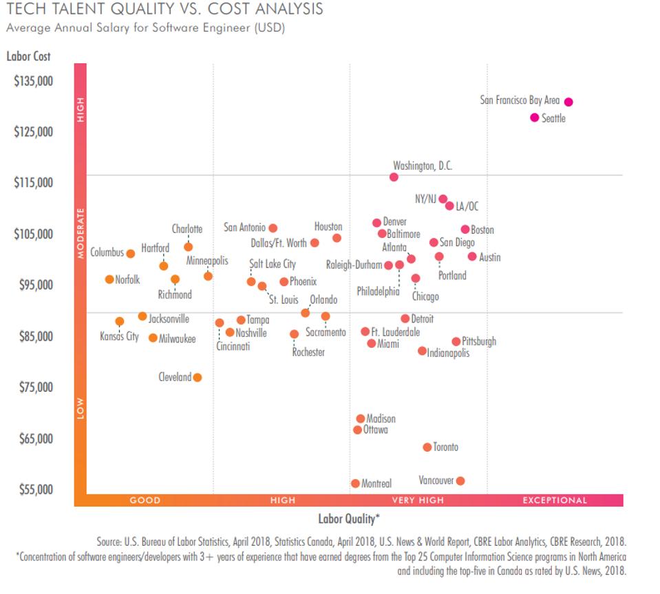 How about quality of talent? CBRE rates New York and Washington, D.C., ‘very high’ based on the presence of graduates from the top 25 computer science programs, and Dallas ‘high,’ but none hold a candle (or trackpad) to Seattle.
